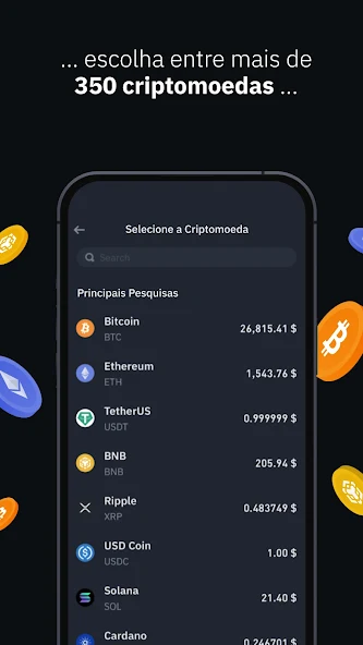 • Ampla variedade de criptomoedas, tokens e produtos financeiros.
